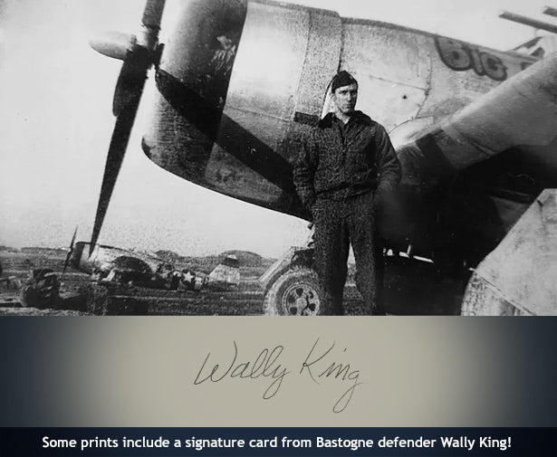 Sold out nearly a decade ago, this extremely rare Artist Proof is from an edition of 155 limited-edition prints, signed by Nicolas Trudgian and including the autographs of 14 Battle of the Bulge veterans: On a separate signature card, perfect to frame with the print, is 406th FG P-47 pilot Wally King (Wally's group is shown). Signing on the print are Band of Brothers Bastogne defenders Buck Compton, Earl McClung, Babe Heffron, Al Mampre, Clancy Lyall, and Brad Freeman, P-47 pilots Bernie Sledzik (his squadron is shown), Herb Prevost, and Ed Cottrell (bonus signer), Sherman tanker Les Underwood (Spearhead), Malmedy survivor Ted Paluch, and riflemen Bob Keck and Jack Blickenderfer. Includes a metal relic from a C-47 that flew the Bastogne resupply, 101st & 3rd Army patches, two photos relating to Bastogne, and a Certificate of Authenticity with "History Behind the Art."