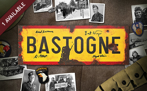 Sign #2 in our new "Sites of Valor" series is here! Each aluminum Bastogne sign is hand-embellished by master craftsmen to include dents, scratches, and chips. Topping it off, each has been hand-signed by at least two veterans who defended Bastogne.
