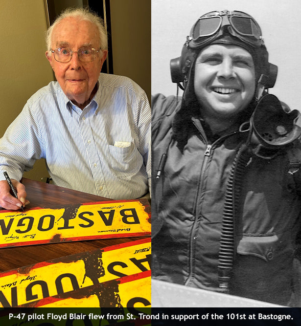 Hand-signed by 101st heroes Brad Freeman (Band of Brothers) and Bert Winzer (G/501st) along with P-47 pilots Ed Cottrell (48th FG) and Floyd Blair (404th FG).